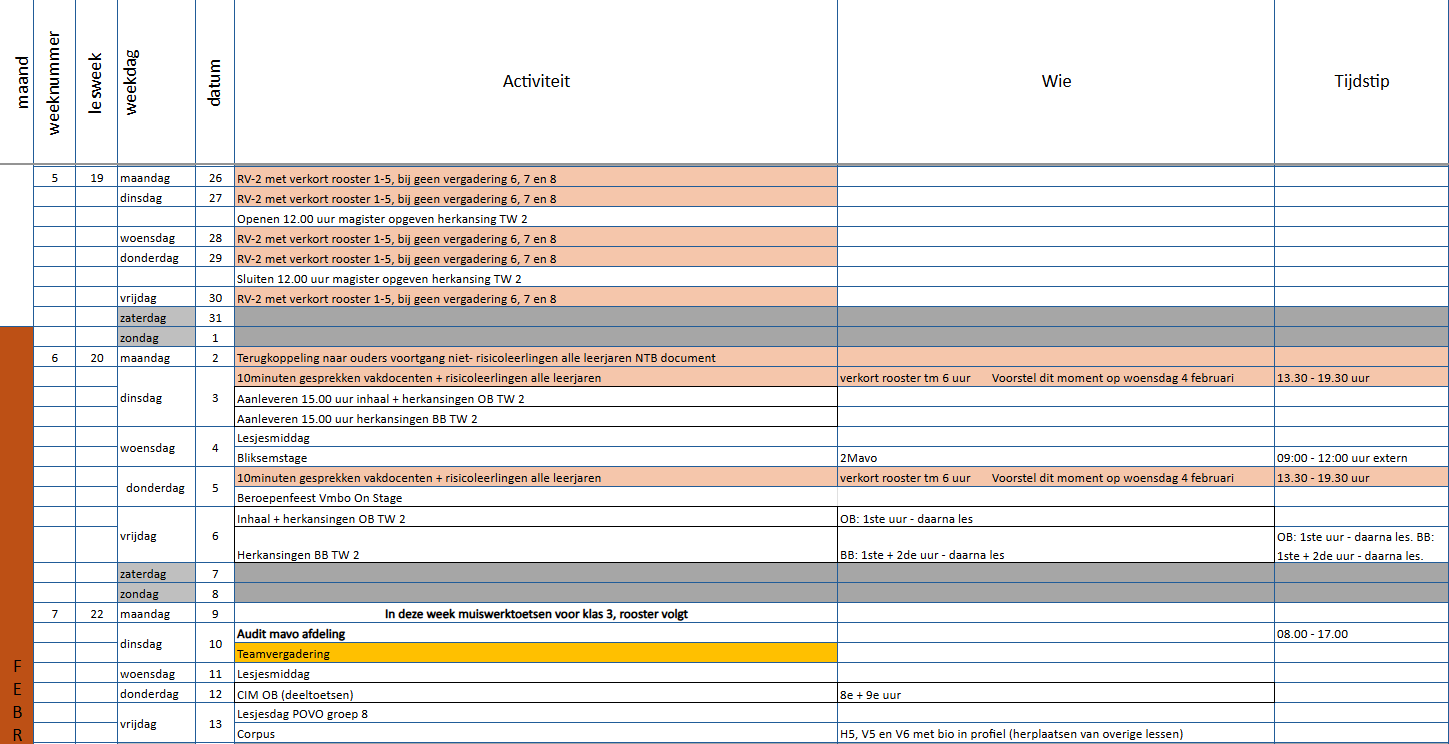 Deze week ontvangen jullie van mij de januaribrief. In deze brief geef je je voorkeuren door voor volgend schooljaar, zoals of je meer of minder wilt werken, welke werkdagen je voorkeur hebben en eventuele wensen rondom verlof, studie en andere afspraken.