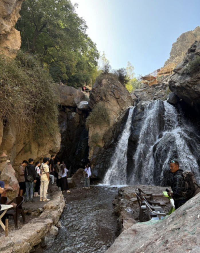 De volgende ochtend vertrokken wij richting de bergen, hier ontmoette we Mohamed, een gids uit Ouirgane. (Tevens ook een vriend van onze collega Maarten). We zijn gaan wandelen door het dropje Ouirgane, de leerlingen waren erg onder de indruk van wat er nog te zien was van de aardbeving. Het uitzicht was ook prachtig en het was leuk om te zien hoe onze leerlingen communiceerden met de zoon van Mohammed. We reden vervolgens verder naar Imlil, waar wij verbleven, niemand van ons was hier eerder geweest, dus dat was leuk. We hebben nog een wandeling gemaakt de volgende dag naar de watervallen.