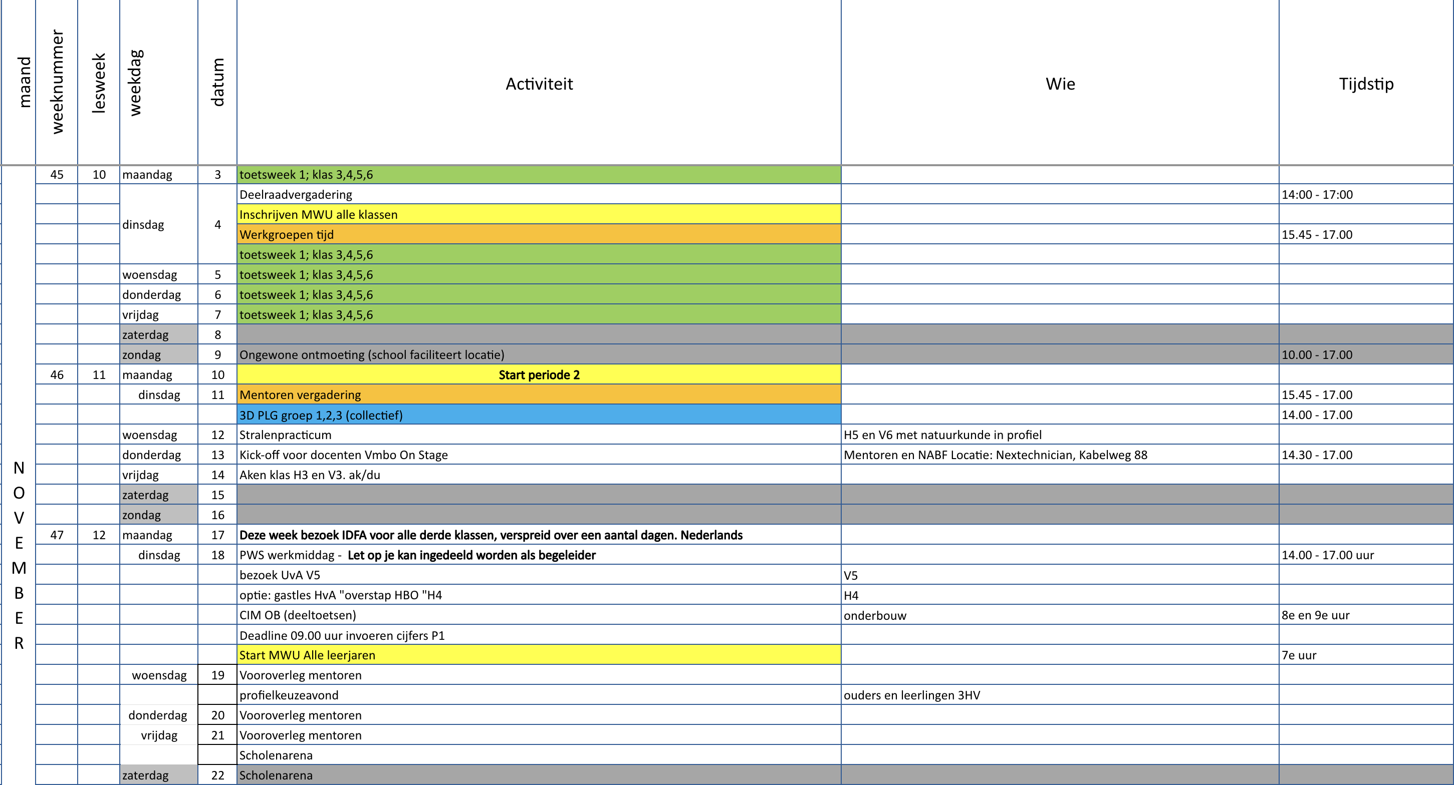 Over drie weken zal mijn laatste werkdag voor mijn verlof zijn. Tot die tijd doe ik het wel iets rustiger aan. Madeleine is zoals jullie al weten al gestart en heeft bijvoorbeeld het voeren van gesprekken met teamleden al overgenomen. Het vriendelijke verzoek om vanaf nu, als je mij mailt ook Madeleine mee te nemen in de cc of je vraag aan haar te richten en mij in de cc. Vanaf 22 november zal ik mijn mails niet meer lezen en beantwoorden. Voor leerlingzaken blijft de mentor eerste contactpersoon en anders Bouteyna.